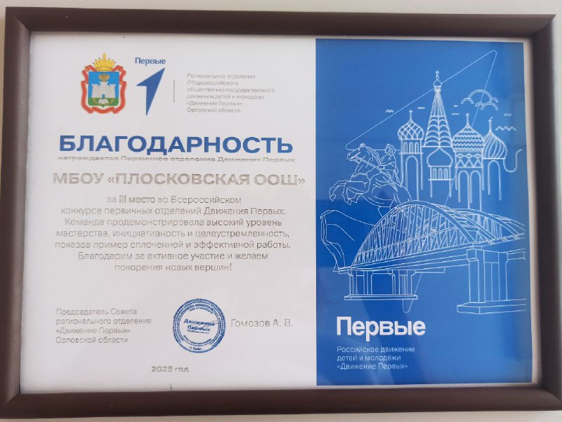 Нашей школе была вручена благодарность за III место во Всероссийском конкурсе первичных отделений «Движения Первых» от председателя совета регионального отделения «Движения Первых» Орловской области — А.В. Гомозова.
